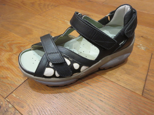 ストレッチウォーカーのサンダルモデルのプルート!新色のブラックファー!ハラコのドット柄がかわいいです。